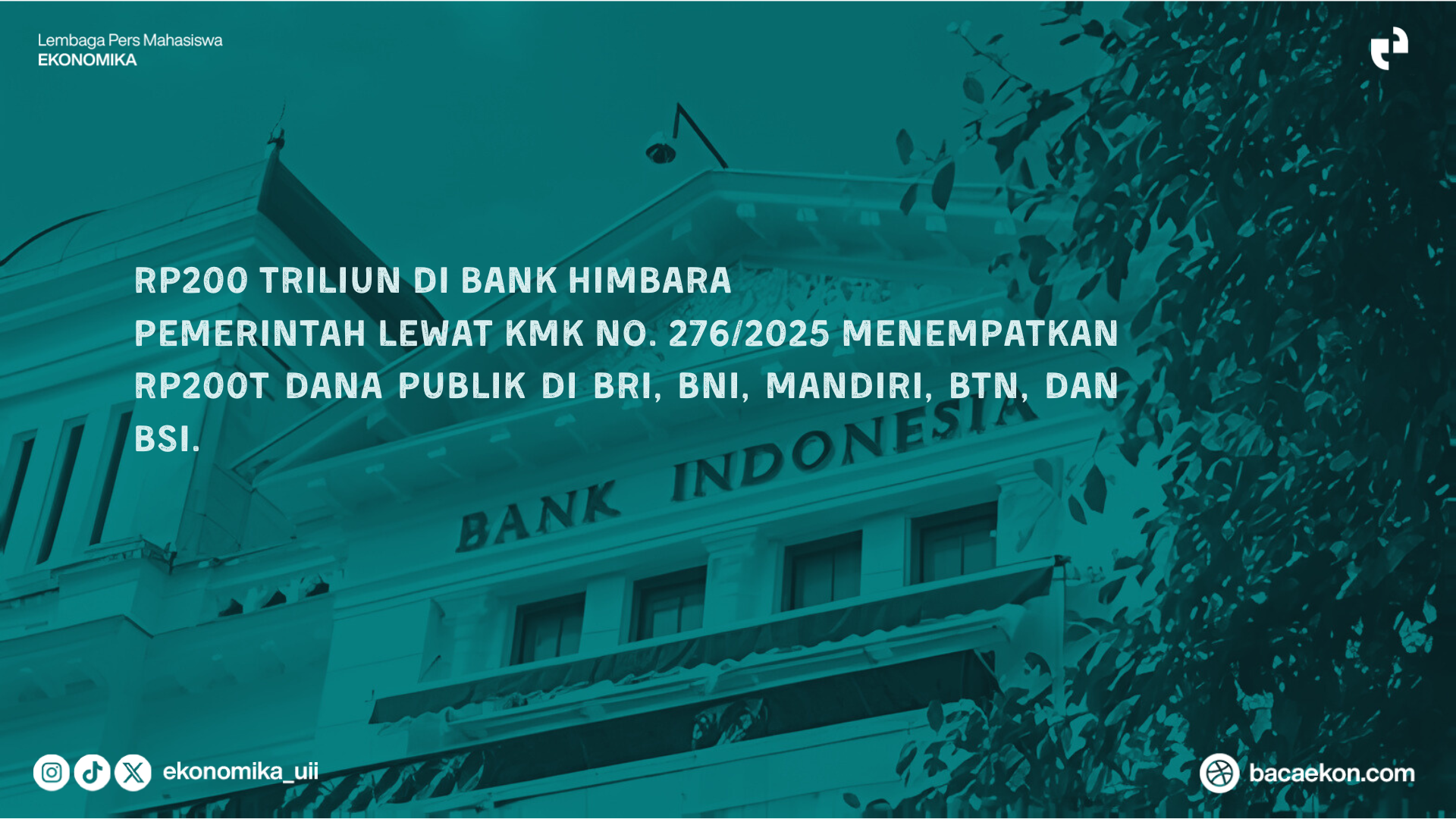 Kebijakan yang mengejutkan hadir dari Kementerian Keuangan. Melalui Keputusan Menteri Keuangan (KMK) Nomor 276 Tahun 2025, Menteri Keuangan Purbaya Yudhi Sadewa menyalurkan dana publik sebesar Rp200 triliun ke lima Bank milik negara (BRI, BNI, Mandiri, BTN, dan BSI). Kebijakan ini bertujuan sebagai upaya untuk memperkuat likuiditas perbankan, menurunkan biaya kredit, dan mendorong sektor riil di tengah ekonomi yang sedang lesu. Namun, di balik angka yang fantastis, muncul pertanyaan utama, apakah uang rakyat sebesar itu benar-benar dapat membangkitkan aktivitas perekonomian? Atau justru akan mengendap dalam sistem perbankan?